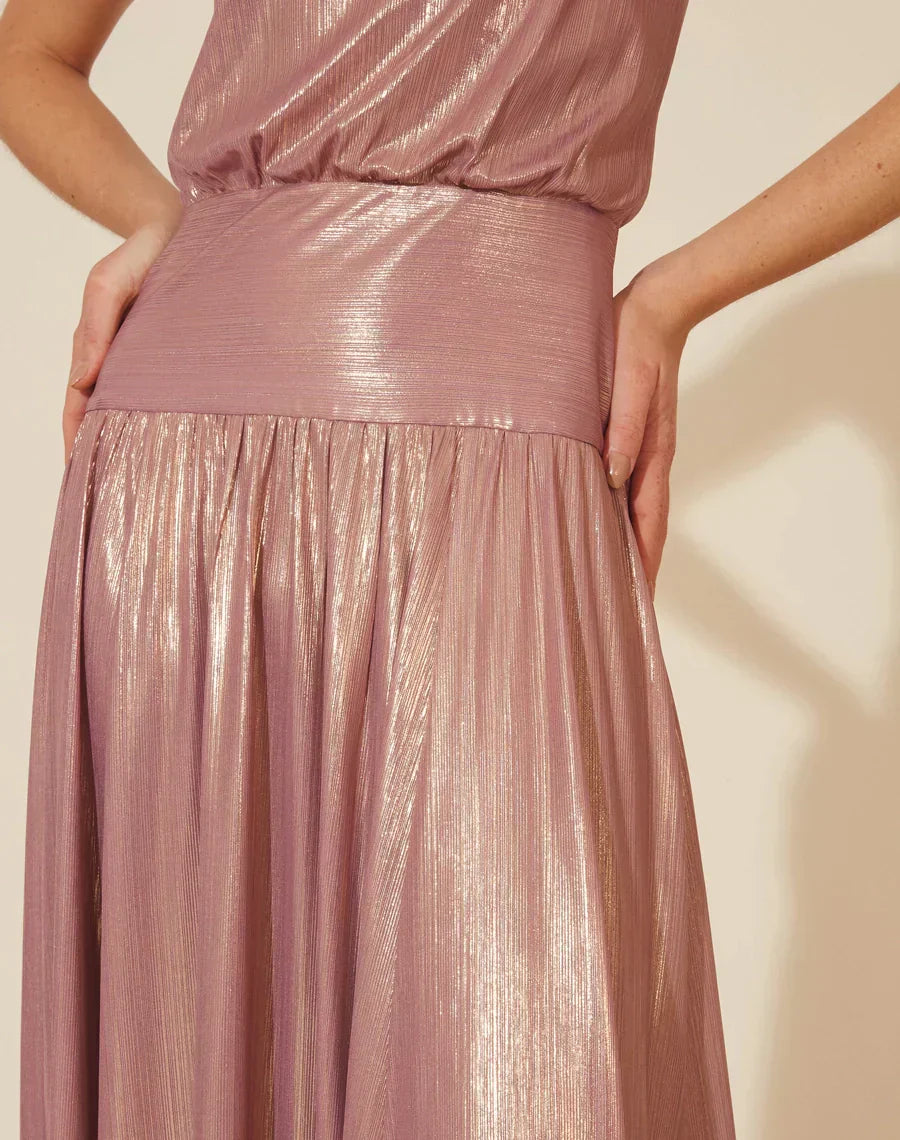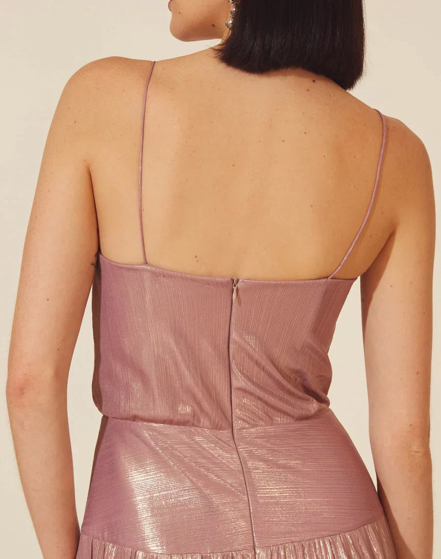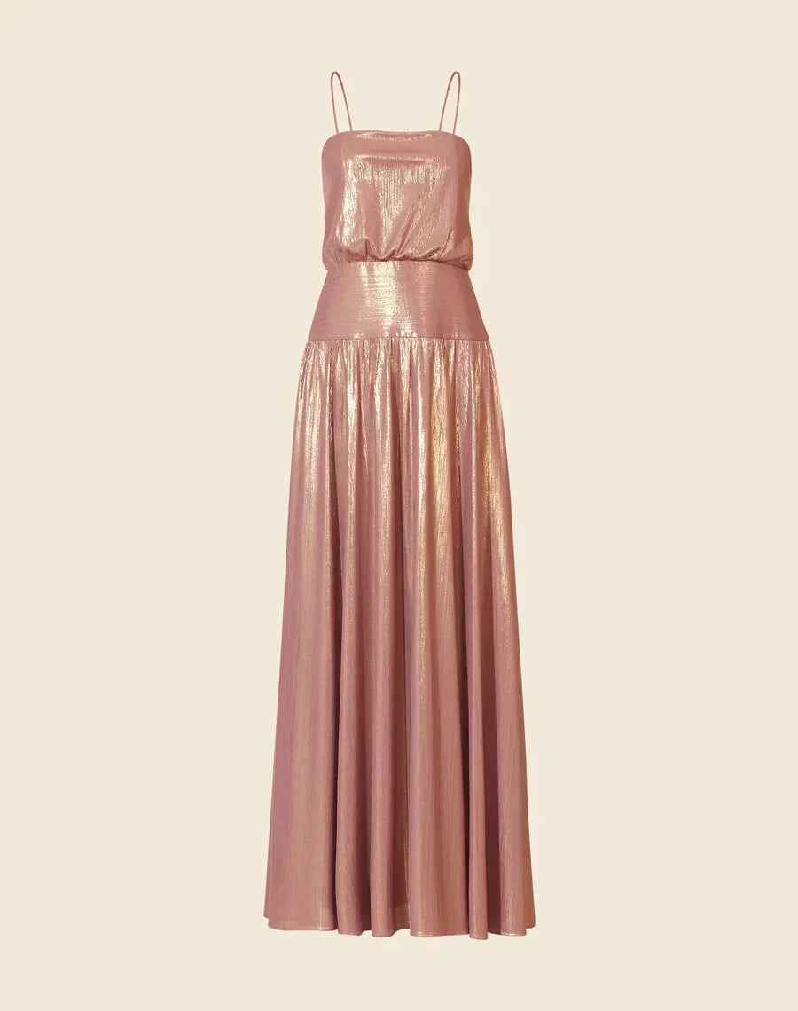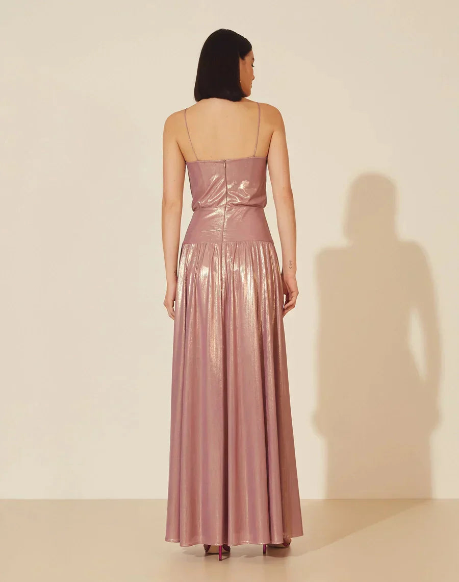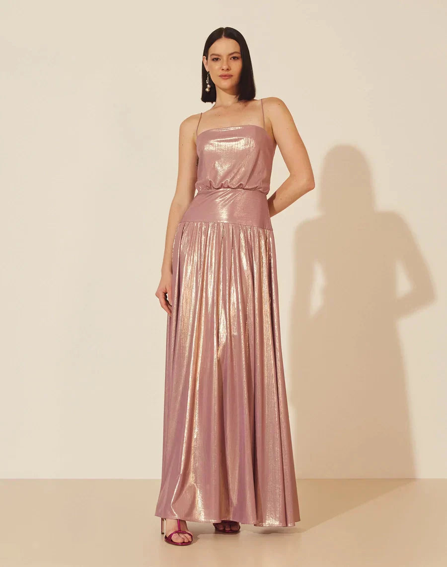 Vestido Longo Prussia confeccionado em lamê, decote quadrado e alças finas.